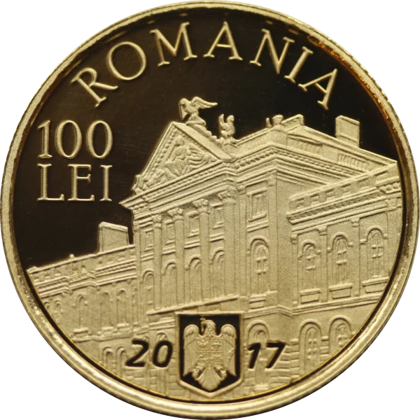 An arc of “ROMANIA” above an historic image of the “Grigore Antipa” Museum, with the coat of arms, face value “100 LEI”, and issue year “2017”.
