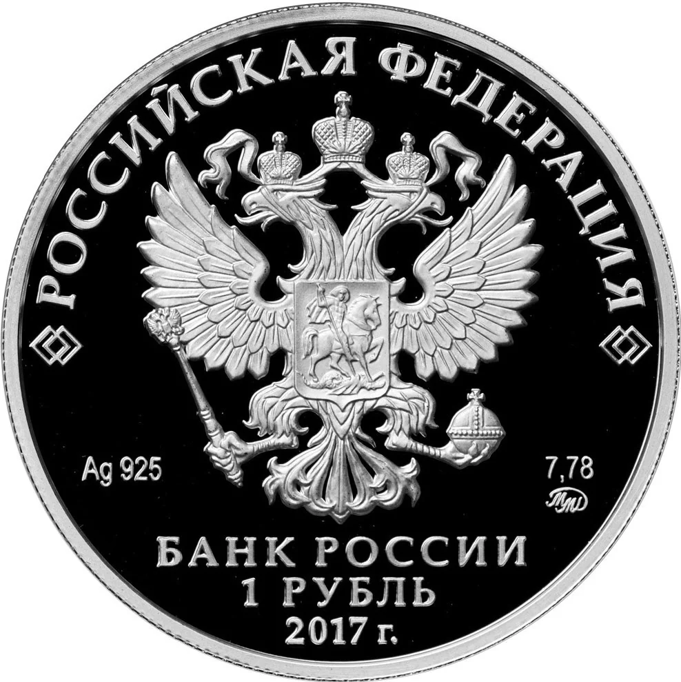 State Coat of Arms of the Russian Federation. Inscriptions: "РОССИЙСКАЯ ФЕДЕРАЦИЯ", "БАНК РОССИИ", "1 РУБЛЬ", and 2017. Metal specification, purity, mint mark, and fine metal content.