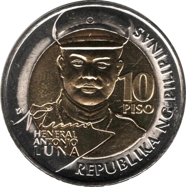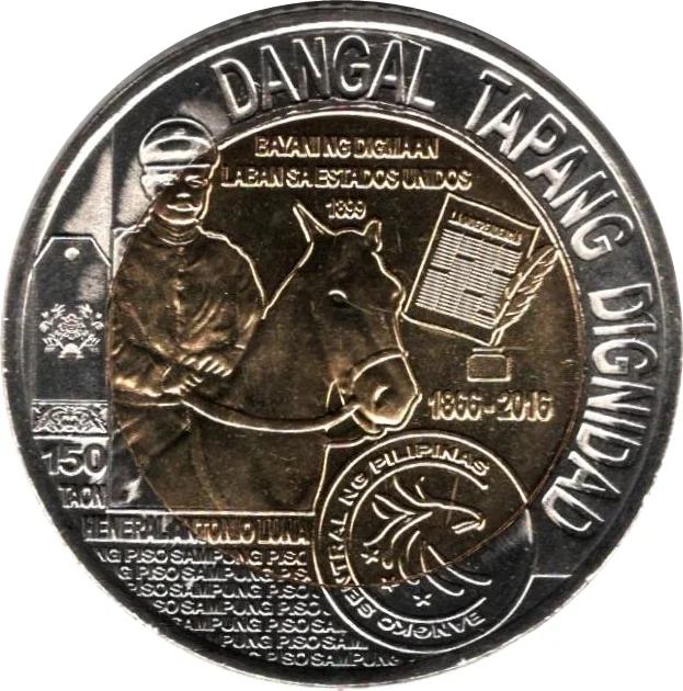 Description: General Luna on horseback with an enlarged epaulet. To the right, a newspaper page with an inkwell above anniversary dates. Below, the Central Bank logo and the value.