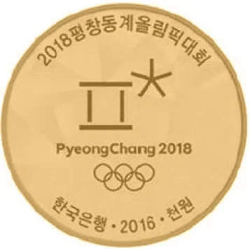 Pyeongchang Olympics emblem: stylized ㅍ and ㅊ (for PyeongChang). Date and denomination below.