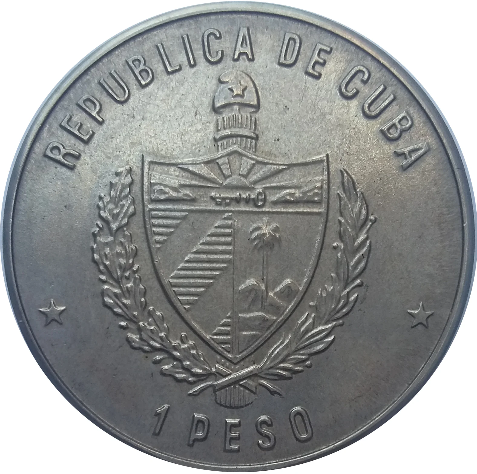 Cuban coat of arms with country name above, face value below, flanked by two five-pointed stars.