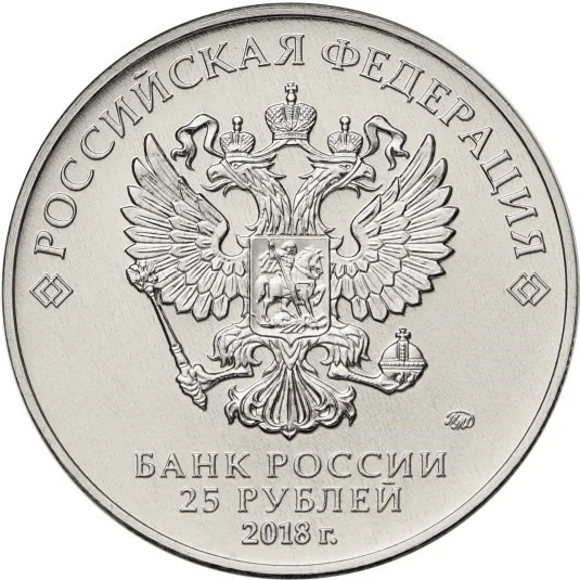 The obverse features the Russian Federation's State Coat of Arms with "РОССИЙСКАЯ ФЕДЕРАЦИЯ" above it. Below are the inscriptions "БАНК РОССИИ", "25 РУБЛЕЙ", "2018", and the Mint's trademark.