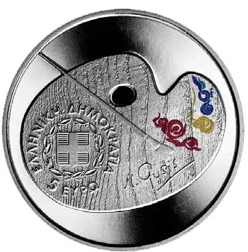 Featuring a painted palette and signature, the design includes the Hellenic Republic text encircling the National Crest on the left, with "5 EURO" in Greek on the lower left.