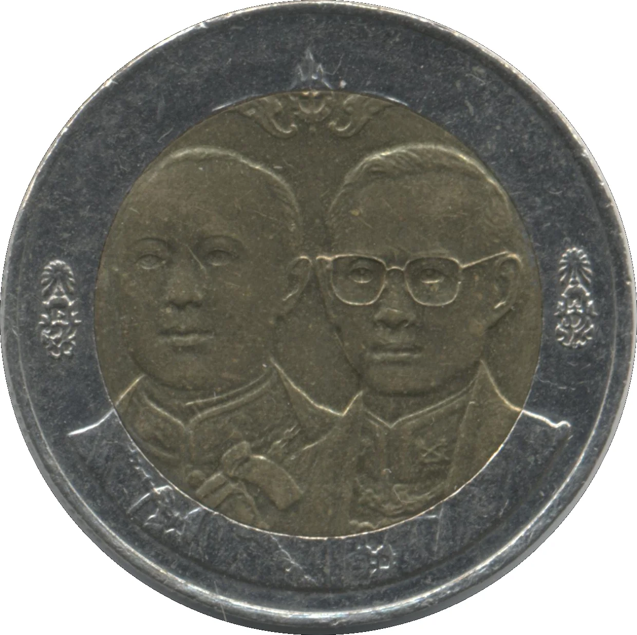 Conjoined busts of Kings Vajiravudh and Bhumibol Adulyadej, front-facing, with their crowned monograms. The House of Chakri emblem is above.