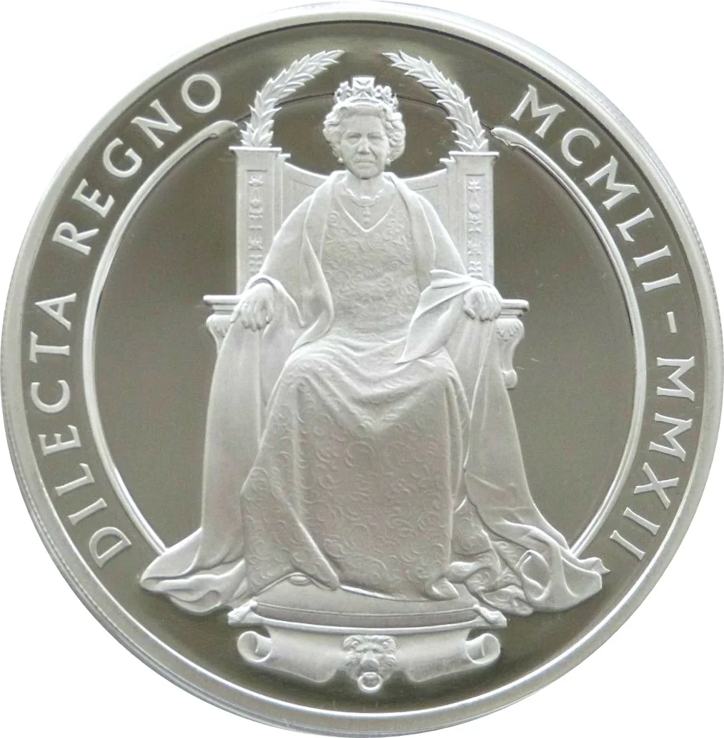 Queen Elizabeth II crowned portrait on throne, surrounded by legend and dates.