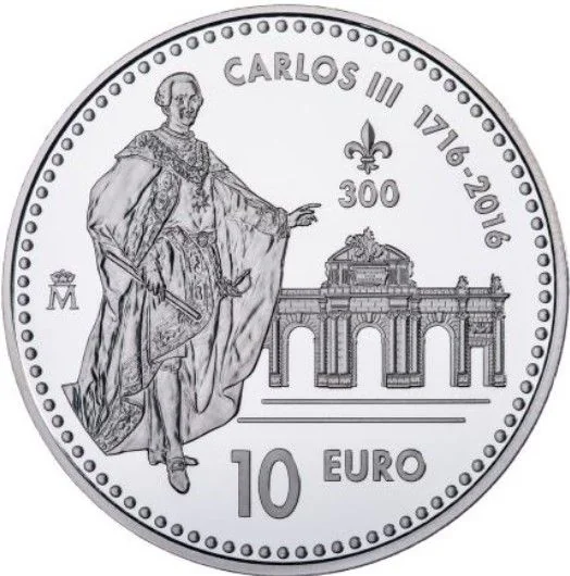 Charles III in Grand Master robes, after Maella's Royal Palace portrait; to the right, the Puerta de Alcalá; above, the number 300 and a fleur-de-lis.