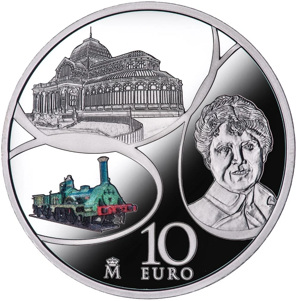 Three oval motifs: the Palacio de Cristal in Madrid's Retiro Park; a portrait of Rosalía de Castro from the Moreno Archive; and the replica of the Mataró locomotive at the Railway Museum of Catalonia.