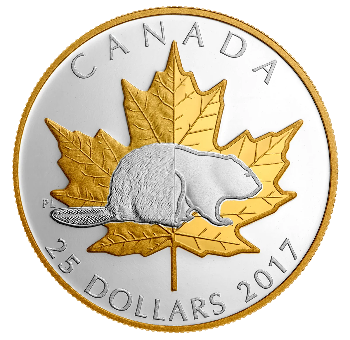 This coin marks Canada's 150th anniversary by blending past and present through its two national icons. The design transitions from classic depictions on the left (1867) to contemporary versions on the right (2017 and beyond). The beaver, a symbol of sovereignty, is shown with a textured historic rear and a modern stylized front. Behind it, the maple leaf evolves from a natural, life-like form on the left to a strong, symmetrical design on the right. Both icons feature selective gold plating.