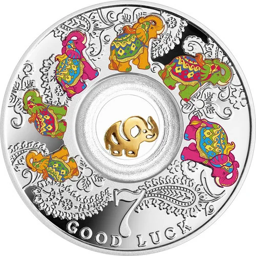 Description: Golden elephant (Loxodonta sp.) in a central transparent circle, surrounded by a horseshoe, four-leaf clover, elephant, and flowers.