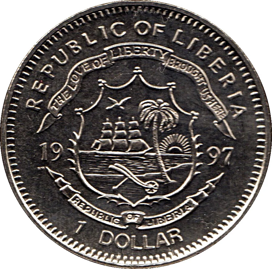 Liberian coat of arms divides date, denomination below.