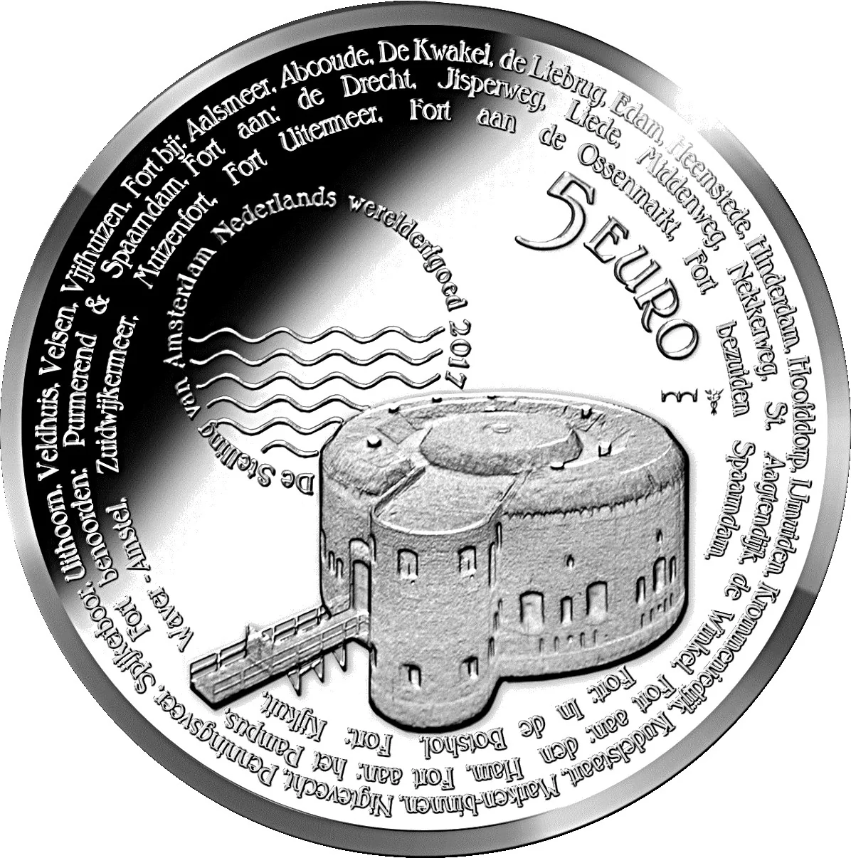 Description: "Fort aan de Ossenmarkt" in Weesp, encircled by Amsterdam Defence Line fortification names. Value, privy mark, and mint mark at right.