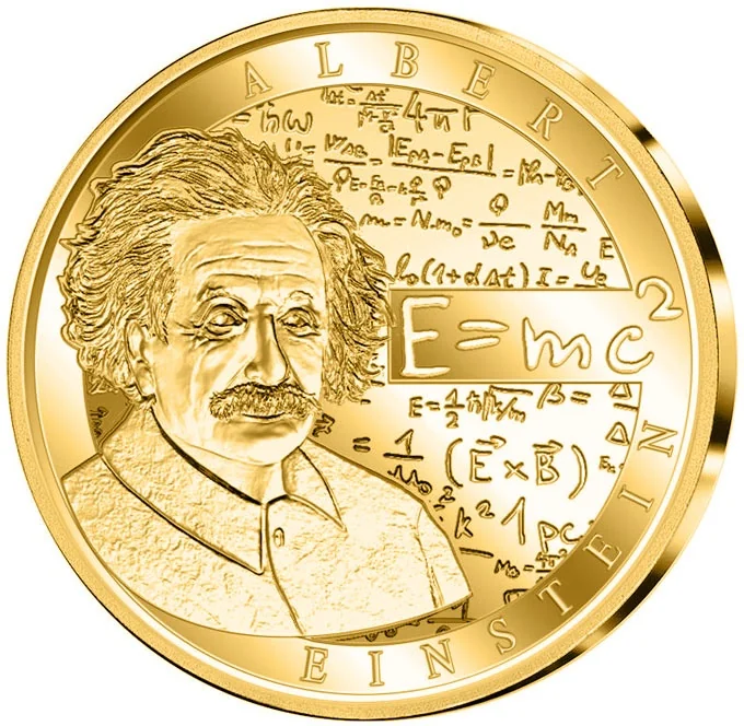 A portrait of Albert Einstein, highlighted by his name and his "E=mc²" formula.