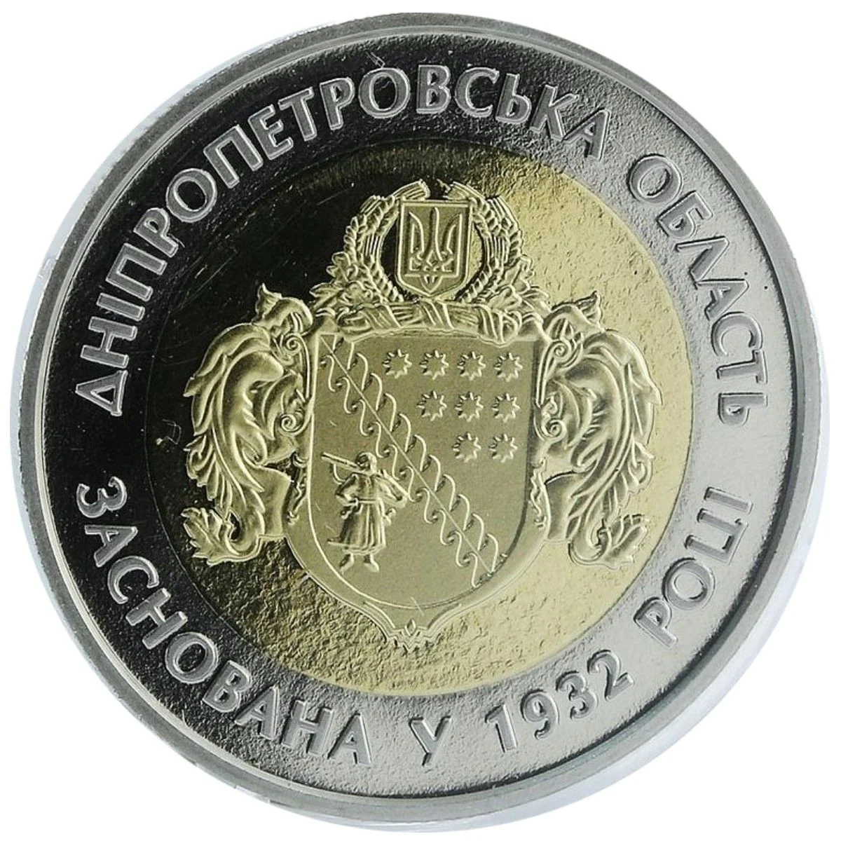 Description: The obverse features Ukraine's small coat of arms above the 2017 issue year, surrounded by the inscriptions "National Bank of Ukraine" and "five hryvnias," along with the mint mark. The central design symbolizes the oblast with the Holy Trinity Cathedral, flanked by a satellite and excavator bucket representing aerospace and metallurgy, and ears of wheat denoting agricultural wealth. A Petrykivka-style flower and brushes are also incorporated.