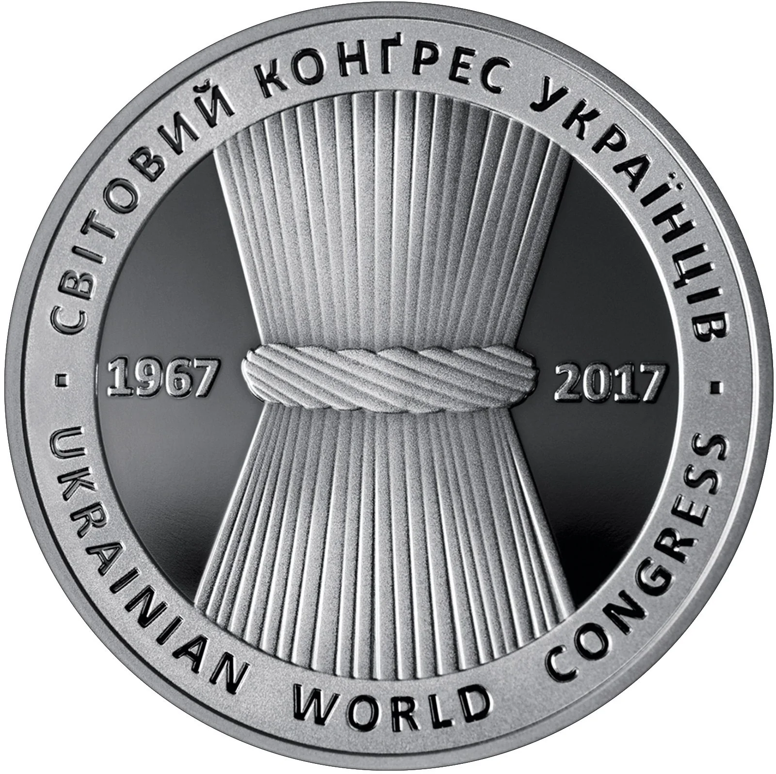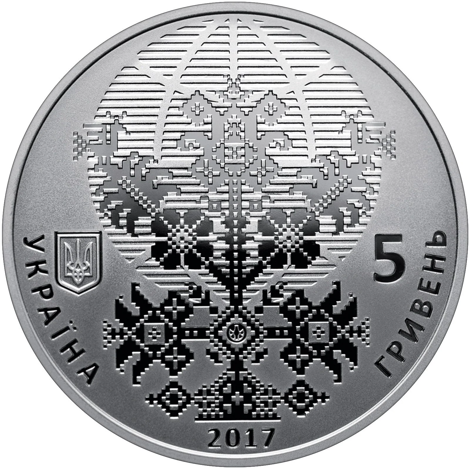 Description: A decorative tree resembling vyshyvanka embroidery stands before a stylized globe. Flanking it are Ukraine's small coat of arms and the inscription "УКРАЇНА" on the left, and the face value "5 ГРИВЕНЬ" on the right. The year 2017 is below, and the NBU mint mark is centered in the tree.