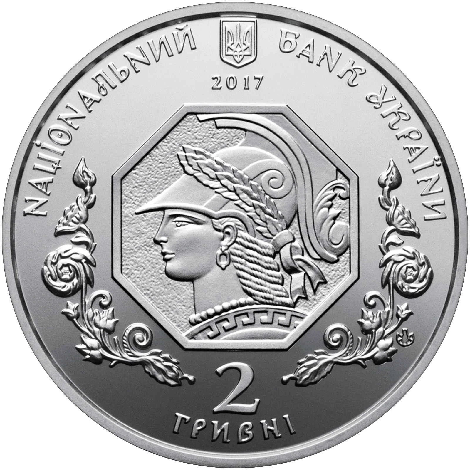 Description: The obverse features Ukraine's small coat of arms above the year 2017. Around the top is the inscription "НАЦІОНАЛЬНИЙ БАНК УКРАЇНИ". Centered is an octagon with floral ornamentation, containing an image of the goddess Minerva. Below is the face value "2 ГРИВНІ", and on the nickel silver version, the mint mark of the NBU Works appears to the right.