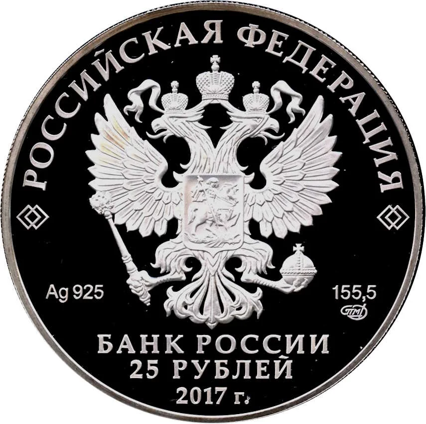 The State Coat of Arms of the Russian Federation in relief. Inscriptions: "РОССИЙСКАЯ ФЕДЕРАЦИЯ", "БАНК РОССИИ", "25 РУБЛЕЙ", "2017", metal designation, purity, the Saint Petersburg Mint mark, and fine metal content.