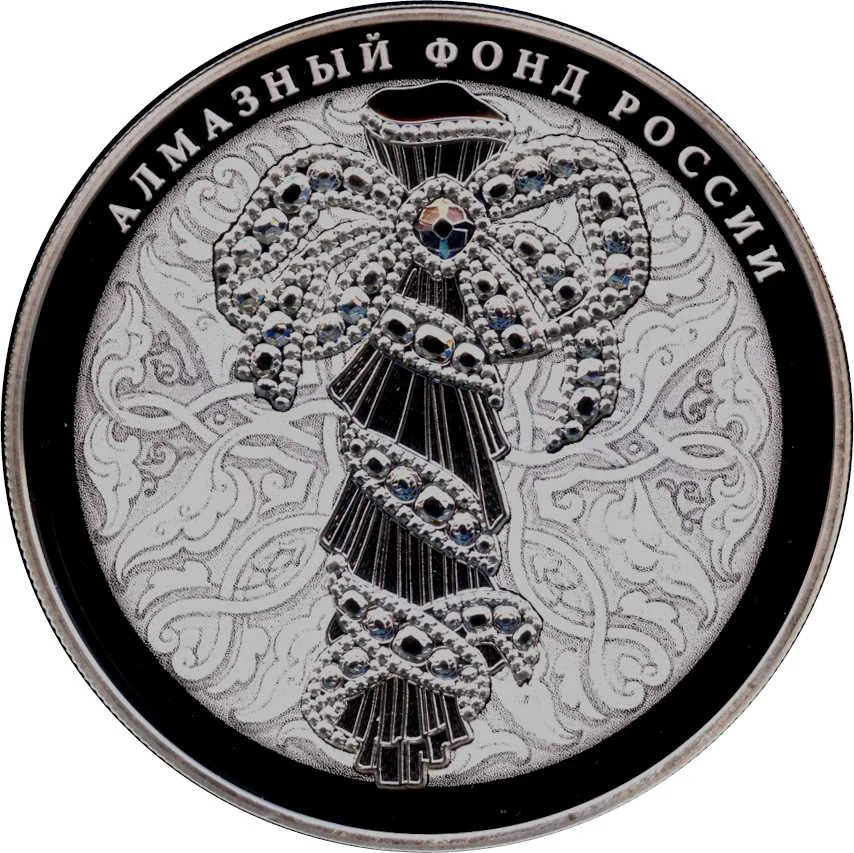 A silver proof "Porte bouquet" coin features the relief image of a porte bouquet. The top circumference bears the inscription "АЛМАЗНЫЙ ФОНД РОССИИ" ("DIAMOND FUND OF RUSSIA").