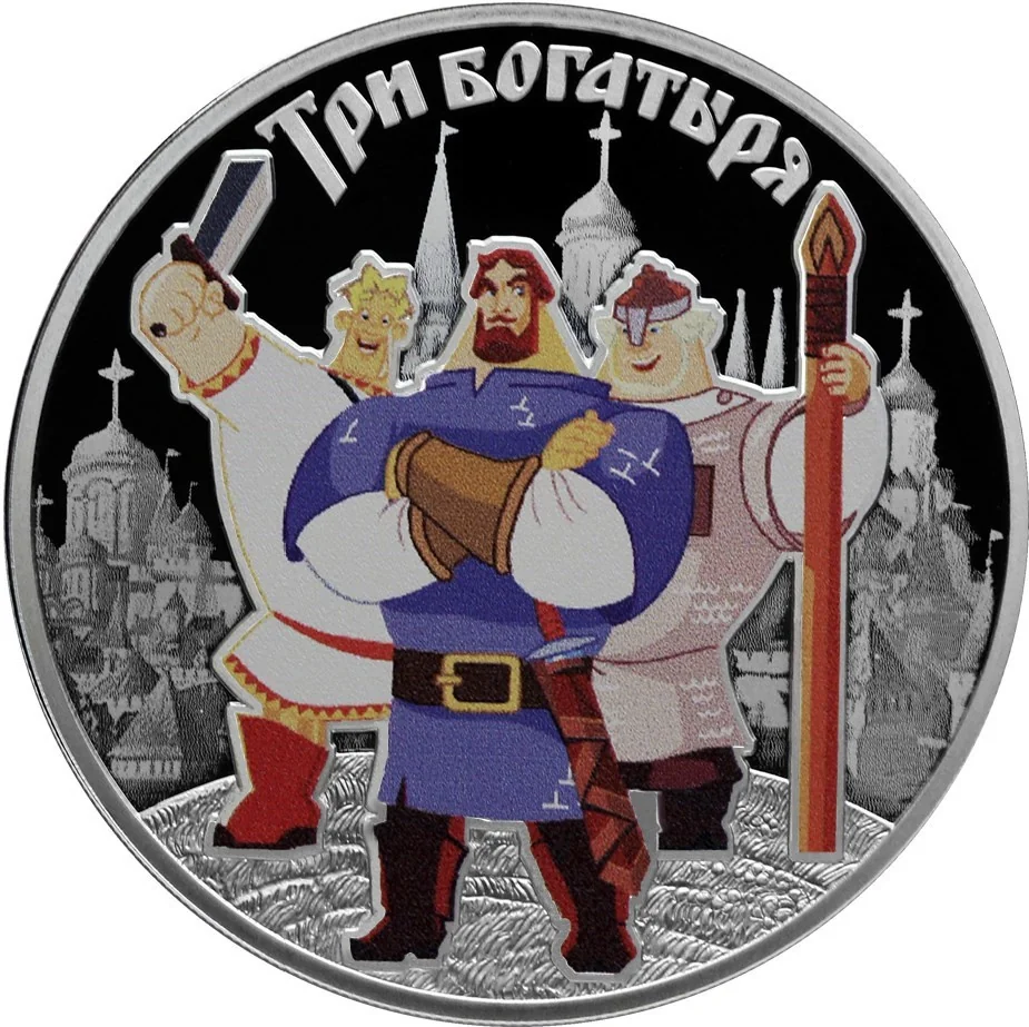 A silver proof "Three Heroes" coin features a color image of the three heroes before an ancient town, with the inscription "ТРИ БОГАТЫРЯ" along the upper circumference.