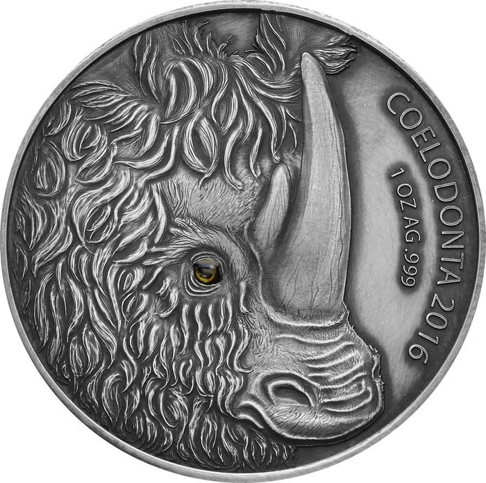 The reverse features the Woolly Rhinoceros, a survivor of the last glacial period, with the inscriptions "COELODONTA," "2016," and "1 OZ AG.999."