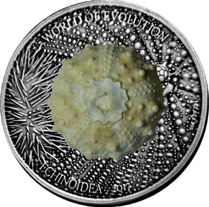 Description: The reverse showcases a real Sea Urchin fossil against an excavation-style background. Inscriptions include "WORLD OF EVOLUTION" (top), "ECHINOIDEA" and "2017" (bottom), and "1OZ AG 0.999" (right side).