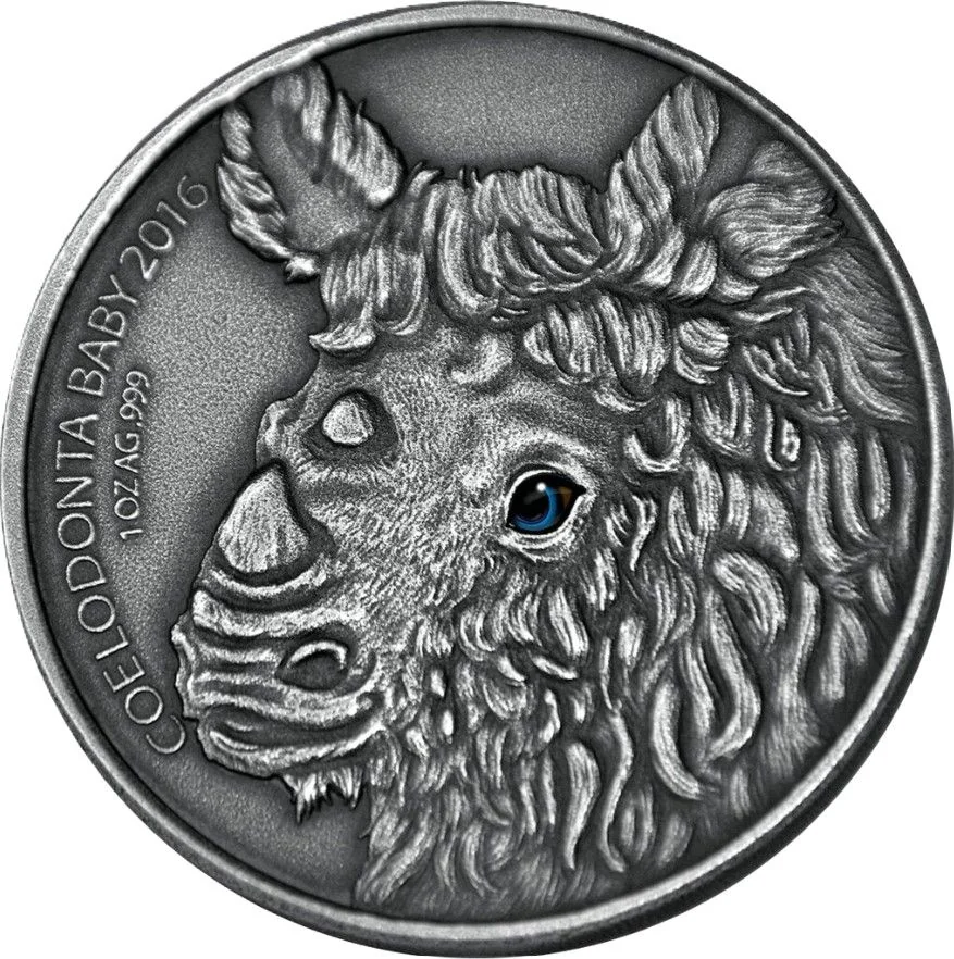 The reverse features the Woolly Rhinoceros Baby, a survivor of the last glacial period. Inscriptions include "COELODONTA BABY," the year "2016," and "1 OZ AG .999."