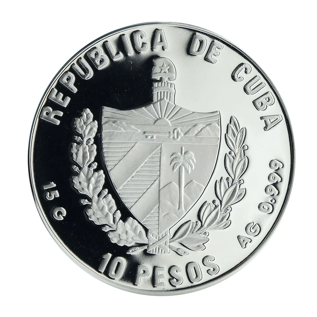 Cuban Coat of Arms with curved country name above, face value below, and fineness and weight on the sides.