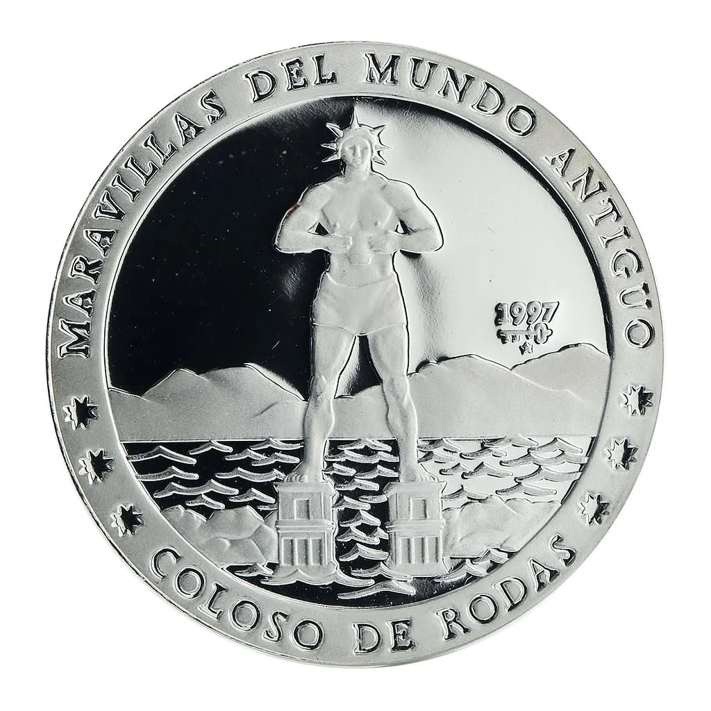 Colossus of Rhodes statue over water; circular legend with event above, location below; date and mintmark at right.