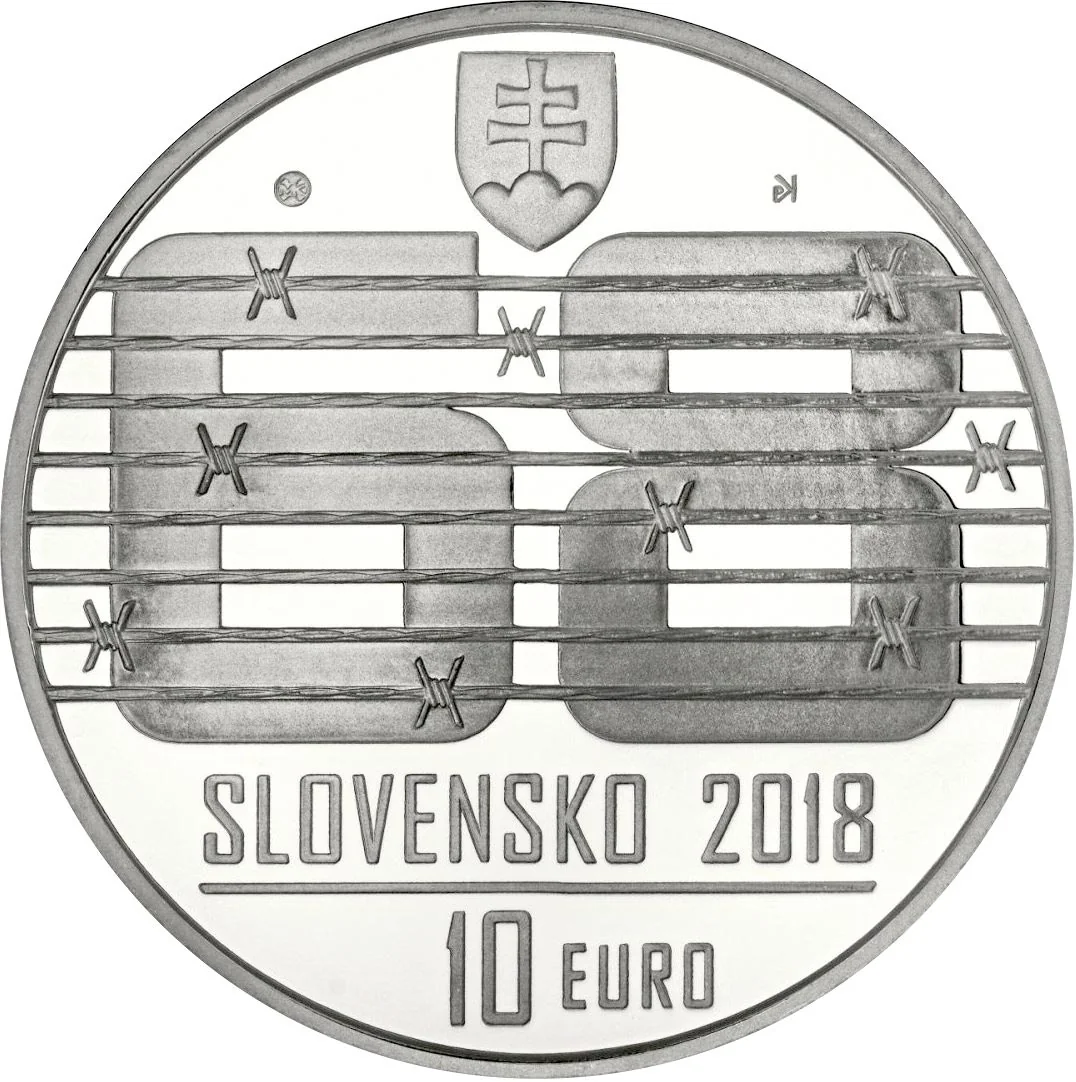 The coin's obverse shows barbed wire with "68" behind it, symbolizing the post-invasion normalization period. The Slovak coat of arms is at the top, with the country, year, and "10 EURO" denomination separated by a line at the bottom.