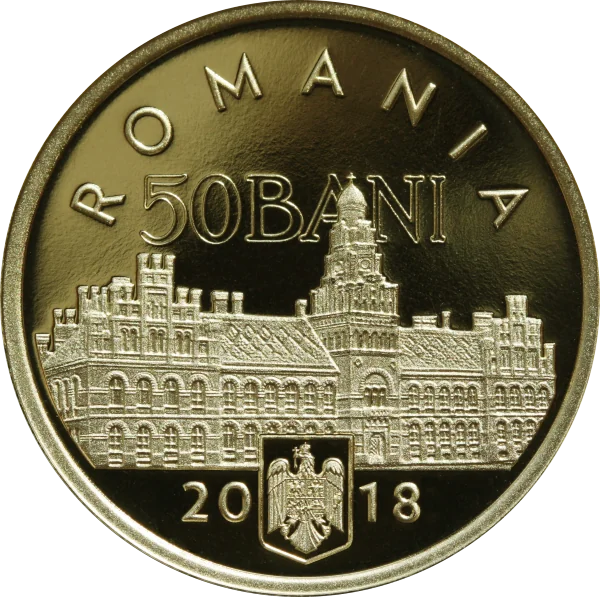 The Cernăuți Metropolitan Palace, site of Bukovina's 1918 union with Romania; featuring an arched "ROMANIA", "50 BANI", Romania's coat of arms, and the year "2018".