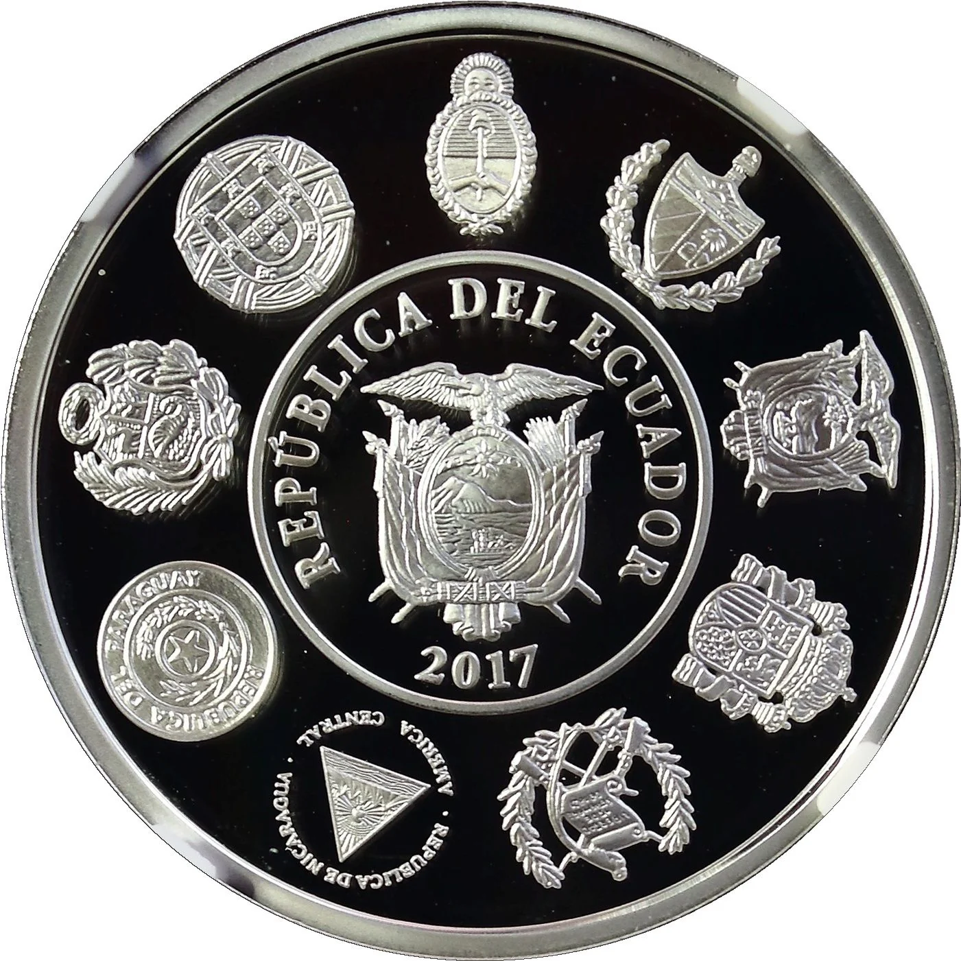 Description: Featuring the Argentine National Shield at its center, this coin is inscribed with "REPÚBLICA DEL ECUADOR" and "2017." Surrounding the emblem are the shields of all participating countries: Argentina, Cuba, Ecuador, Spain, Guatemala, Nicaragua, Paraguay, Peru, and Portugal.