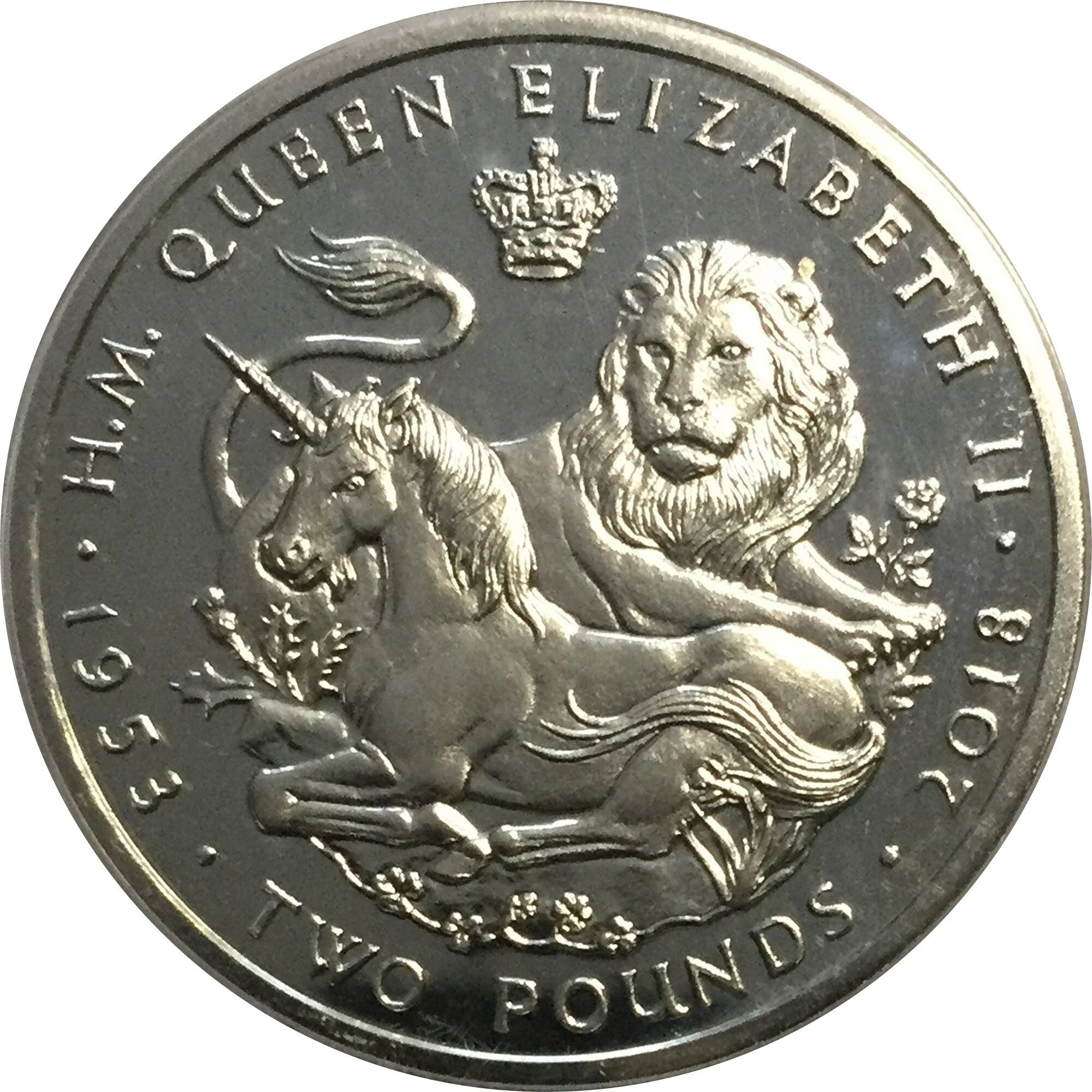 A crown above a lion and unicorn resting among UK national plants, with the value below between 1953 and 2018.