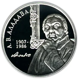 Central relief portrait of Alena V. Aladava, director of the museum (1944–1977), against a carved frame fragment. Left: circumferential inscription "А.В. АЛАДАВА". Below: her lifespan and a facsimile of her signature on the left.