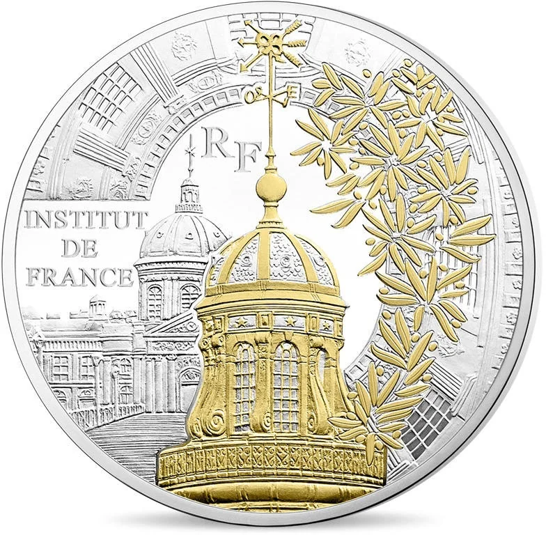 This coin shows the institute's façade from the Pont des Arts, with a laurel branch—inspired by academicians' robes—accented in gold.