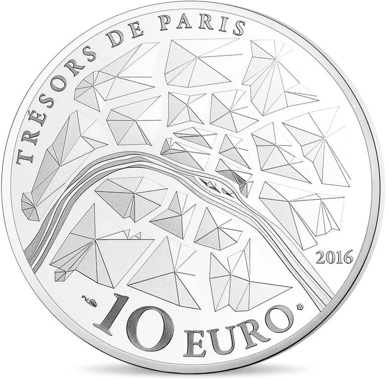 The reverse depicts a modern map of Paris with its districts as small pyramids.