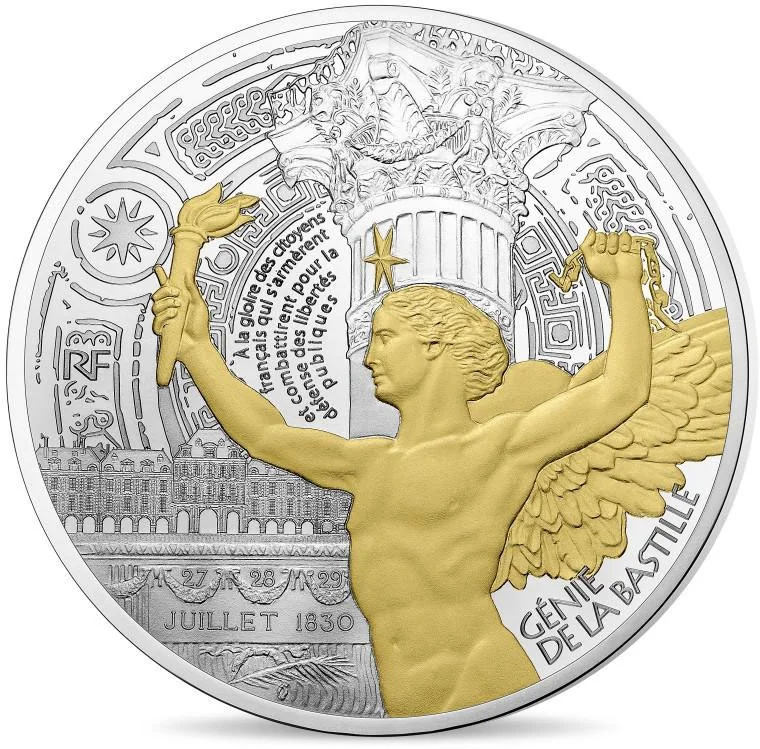 This coin features the gilded Genius of the Bastille atop its column, overlooking the square and its buildings. An excerpt honoring the citizens who fought for public liberties is inscribed, along with the dates of July 27, 28, and 29.