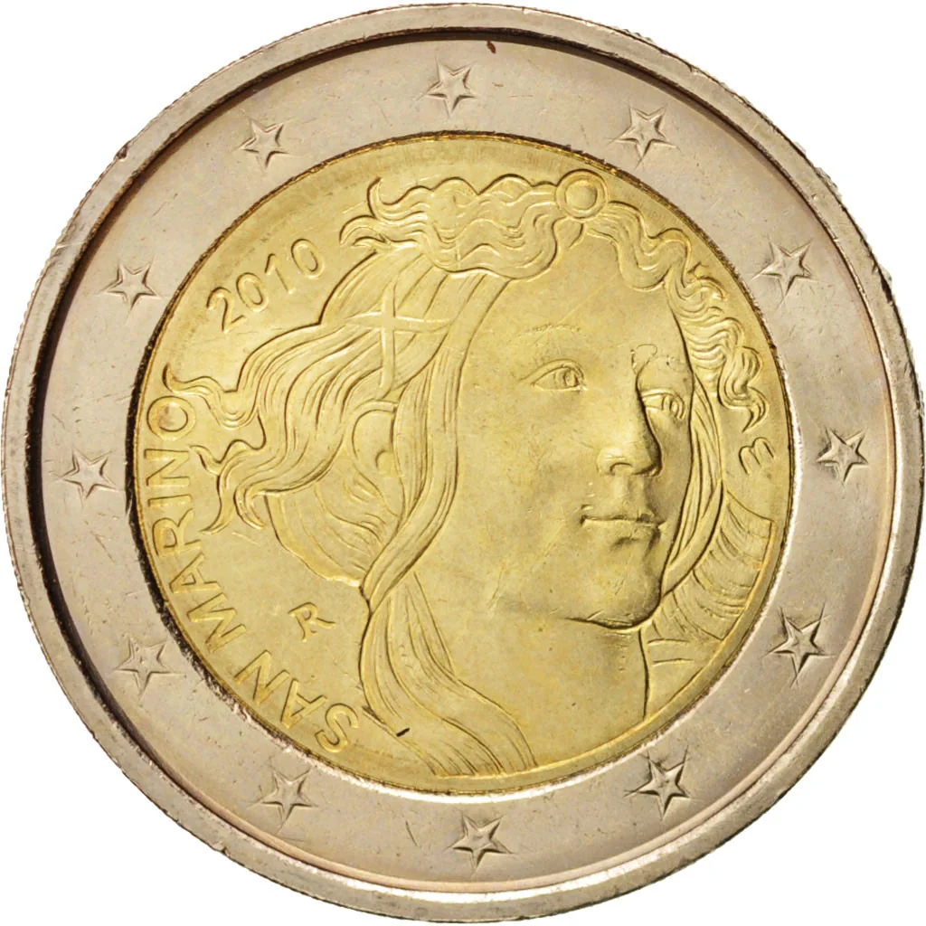 This coin commemorates the 500th anniversary of the death of the Florentine painter Sandro Botticelli. Its outer ring features the 12 stars of the European Union.