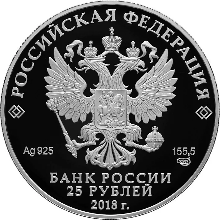 The obverse features the State Coat of Arms of the Russian Federation, inscriptions for "RUSSIAN FEDERATION," "BANK OF RUSSIA," "25 ROUBLES," "2018," metal specifications, mint mark, and fine metal content.