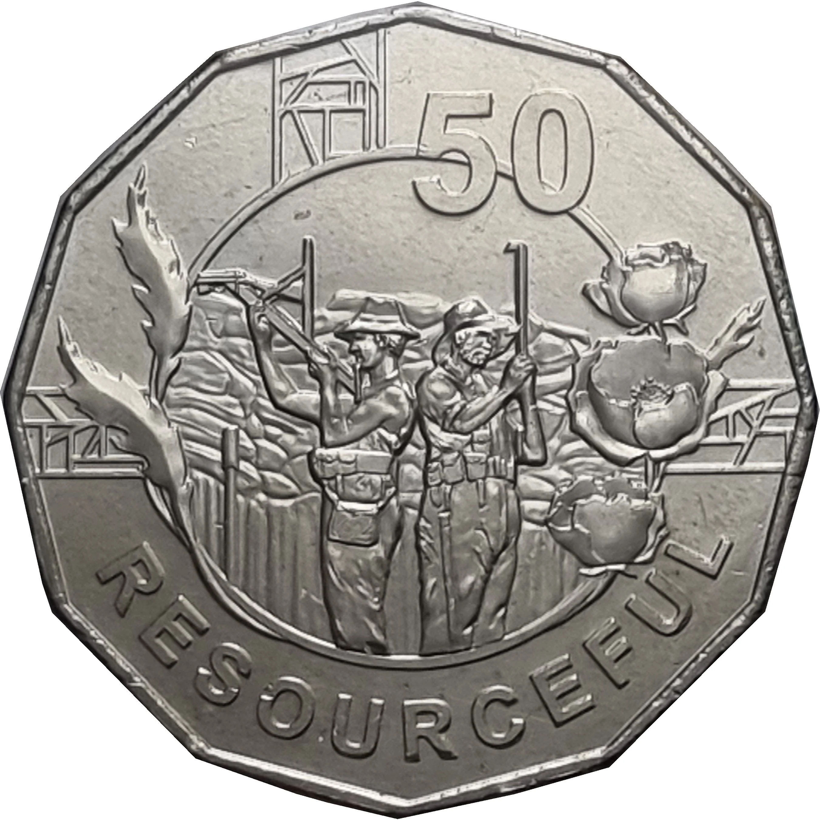 Two Australian soldiers in a WWI trench using a periscope rifle, shown within a circle. The circle is ringed by three poppy sprigs and flanked by angular shapes.