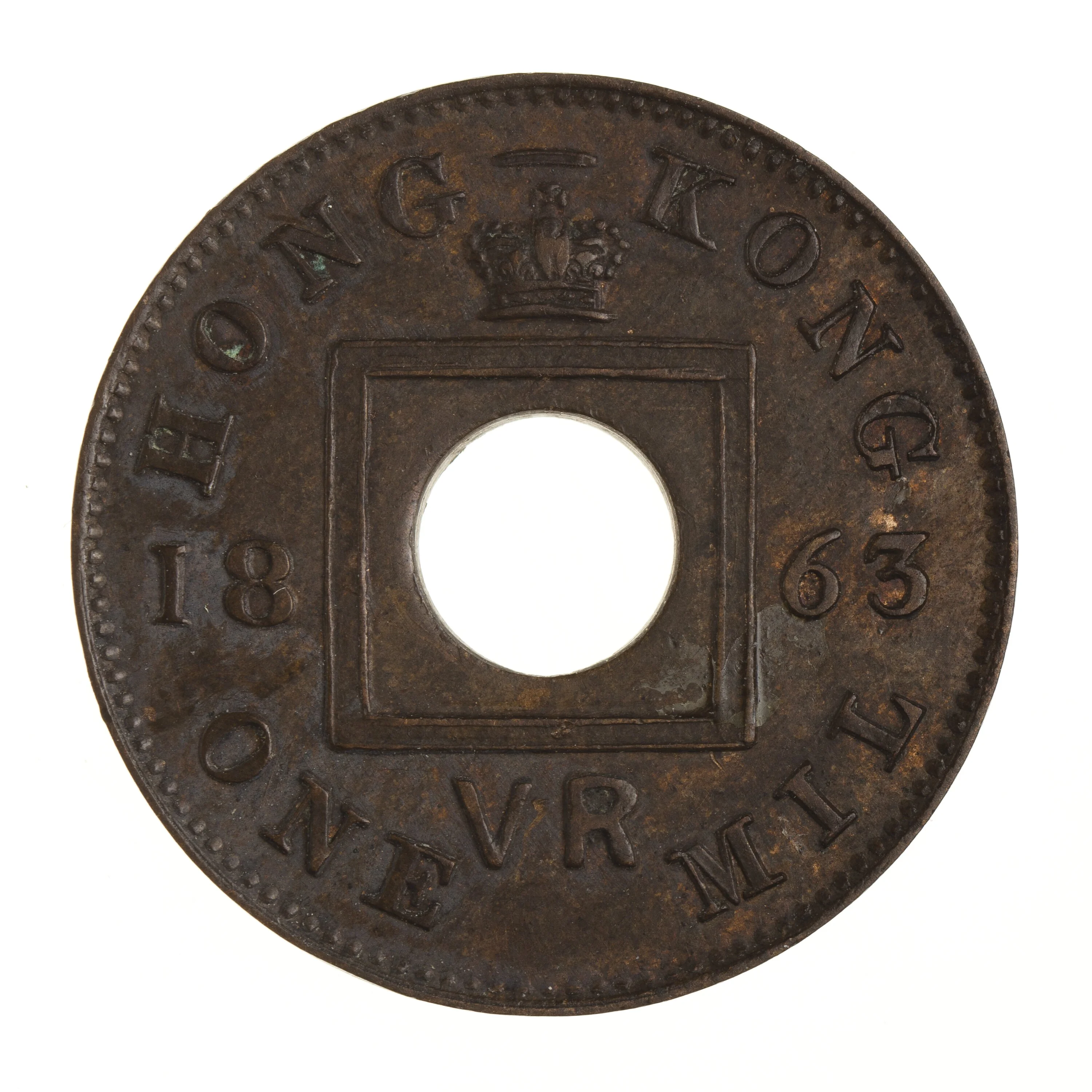 To address the chronic small change shortage, the Hong Kong government took a significant step in 1863 by authorising the minting of its first local coinage at the new Hong Kong Mint. This inaugural issue included silver half-dollars, as well as one-cent and one-mill coins in bronze. However, the venture faced immediate difficulties. The new coins, particularly the one-cent piece, were mistakenly minted with a denomination written only in English ("ONE CENT"), which was poorly received by a population accustomed to Chinese characters on currency. This design error undermined public trust and hindered their circulation.