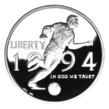 The 1994 World Cup logo flanked by laurel branches, with the denomination below.