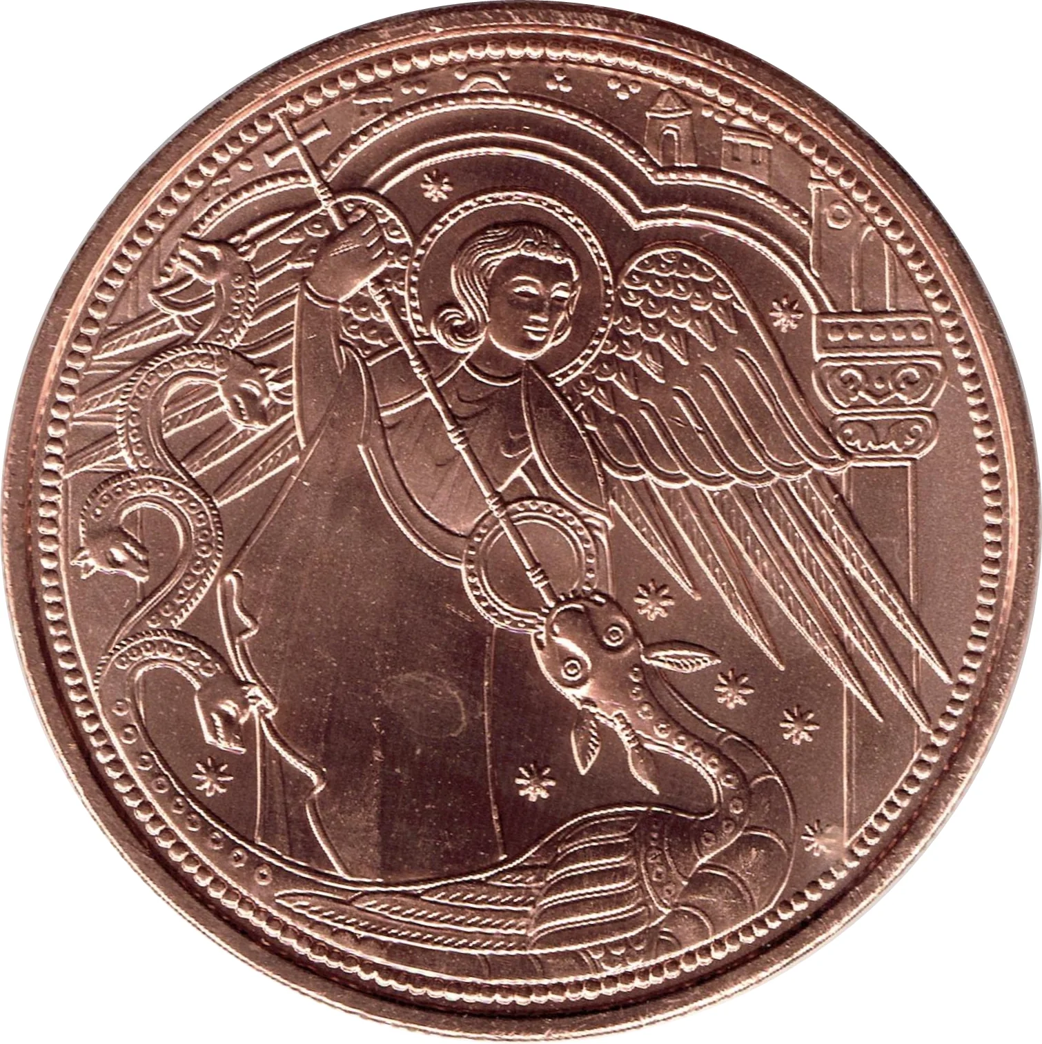 The reverse features a detail from the 13th-century painting of Saint Michael fighting the dragon, attributed to the Mestre de Soriguerola, in Barcelona's Museu Nacional d’Art de Catalunya.