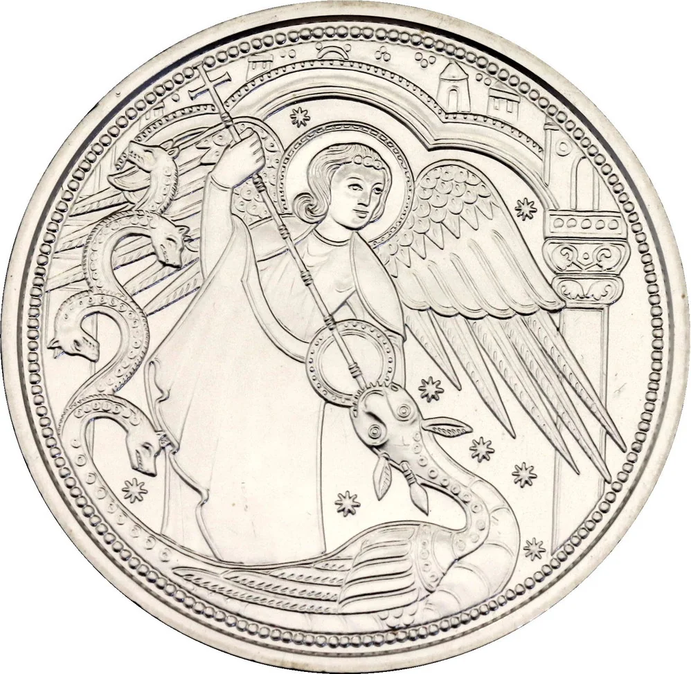 The reverse features a detail from the 13th-century painting of Saint Michael fighting the dragon, attributed to the Mestre de Soriguerola, in Barcelona's Museu Nacional d’Art de Catalunya.