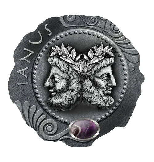 Janus faces back-to-back in dotted circle. Amethyst at base.