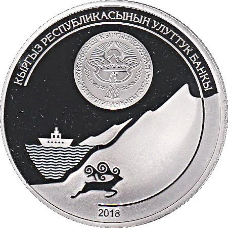 Bank of Kyrgyzstan, lake with ship and mountains. Date below.