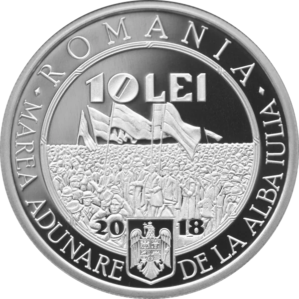 The 2018 10 Lei coin commemorates the 1918 Great Union at Alba Iulia, featuring the inscriptions "ROMANIA," "MAREA ADUNARE DE LA ALBA IULIA," Romania's coat of arms, and the year.
