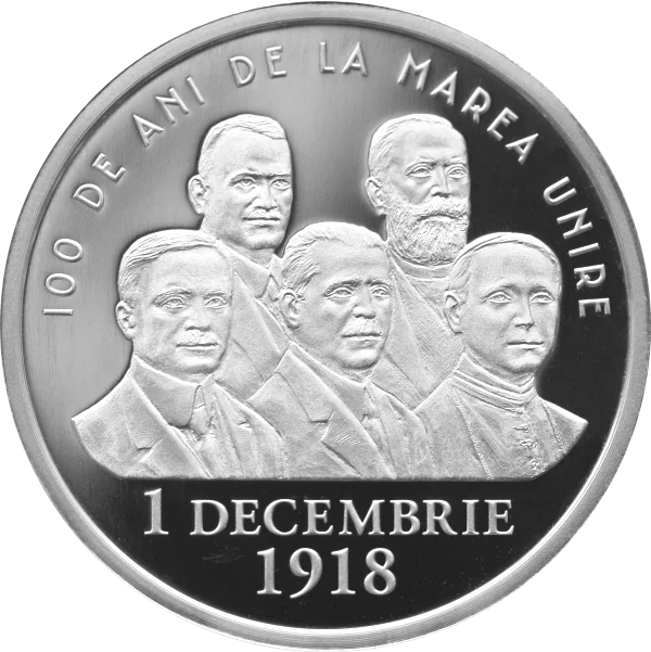 Portraits of Ștefan Cicio-Pop, Gheorghe Pop de Băsești, Iuliu Maniu, Vasile Goldiș, and Iuliu Hossu; the arched inscription “100 DE ANI DE LA MAREA UNIRE” and the date “1 DECEMBRIE 1918”.