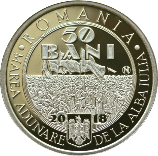 A 50 Bani coin from 2018, commemorating the 1918 Great Union in Alba Iulia. It features the inscriptions "ROMANIA" and "MAREA ADUNARE DE LA ALBA IULIA," Romania's coat of arms, and the year.