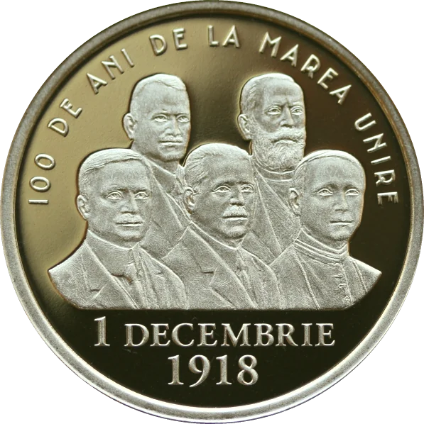 Portraits of Ștefan Cicio-Pop, Gheorghe Pop de Băsești, Iuliu Maniu, Vasile Goldiș, and Iuliu Hossu; the arched inscription “100 DE ANI DE LA MAREA UNIRE” and the date “1 DECEMBRIE 1918”.
