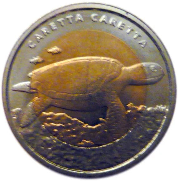 Loggerhead turtle swimming right over seabed, two small fish above, text across top.