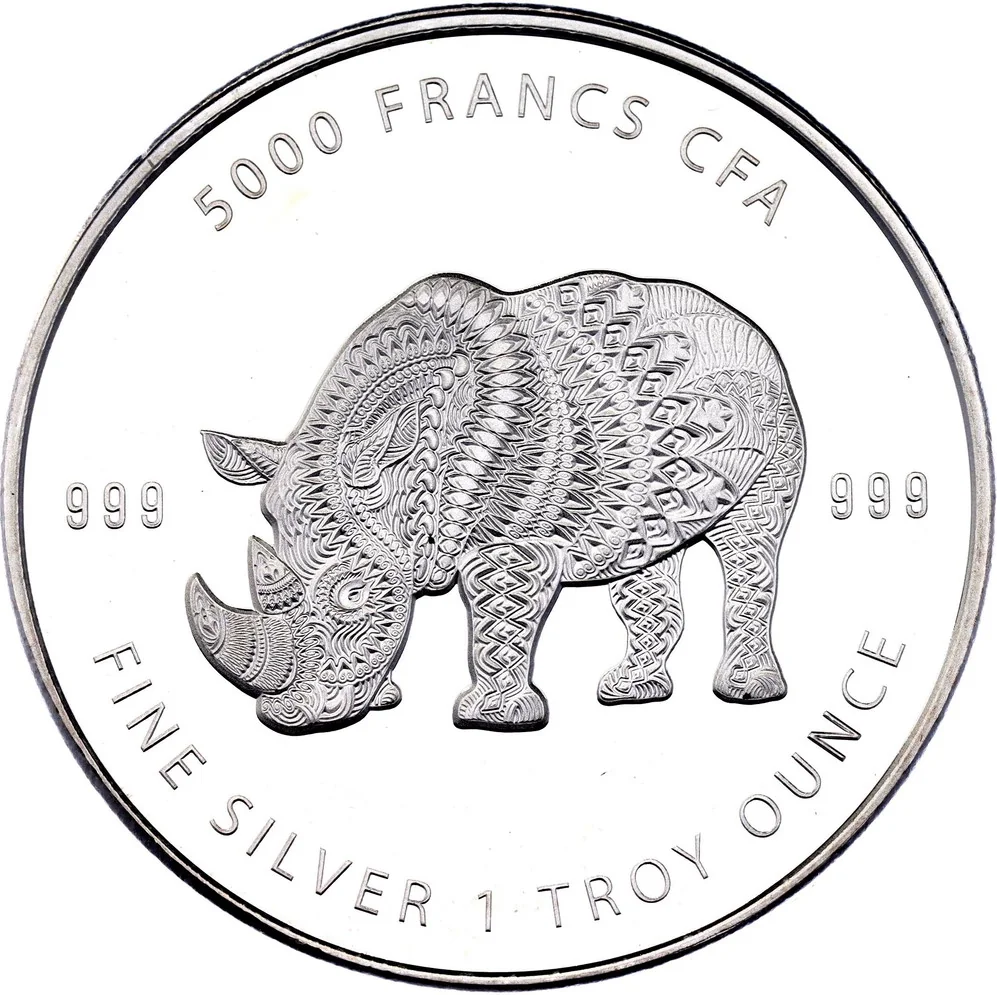 Rhinoceros with mandala print; denomination above, weight below, purity on sides.